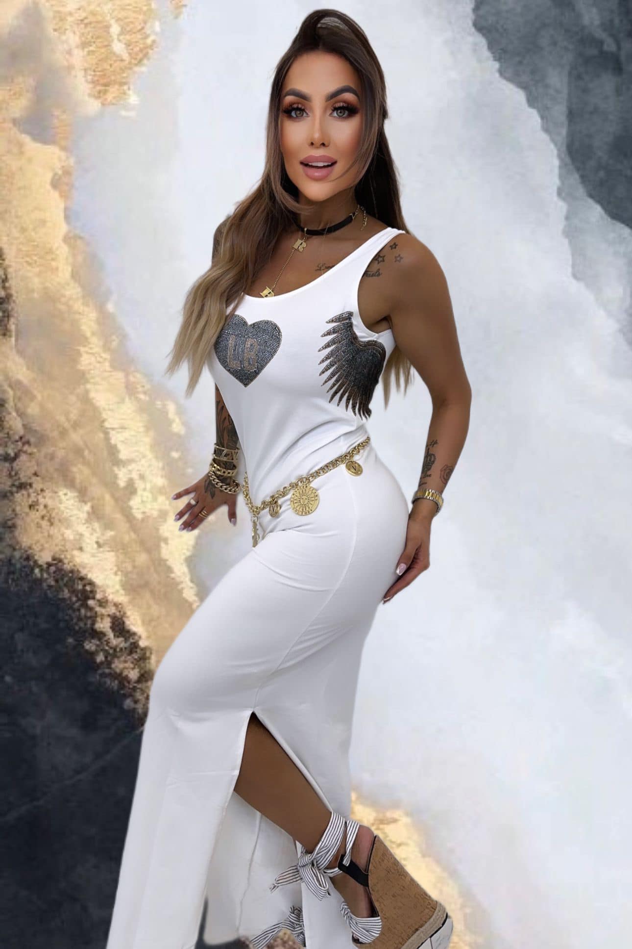 Sukienka damska maxi biała z modnym logo na ramiączkach polskiej marki Lola Bianka