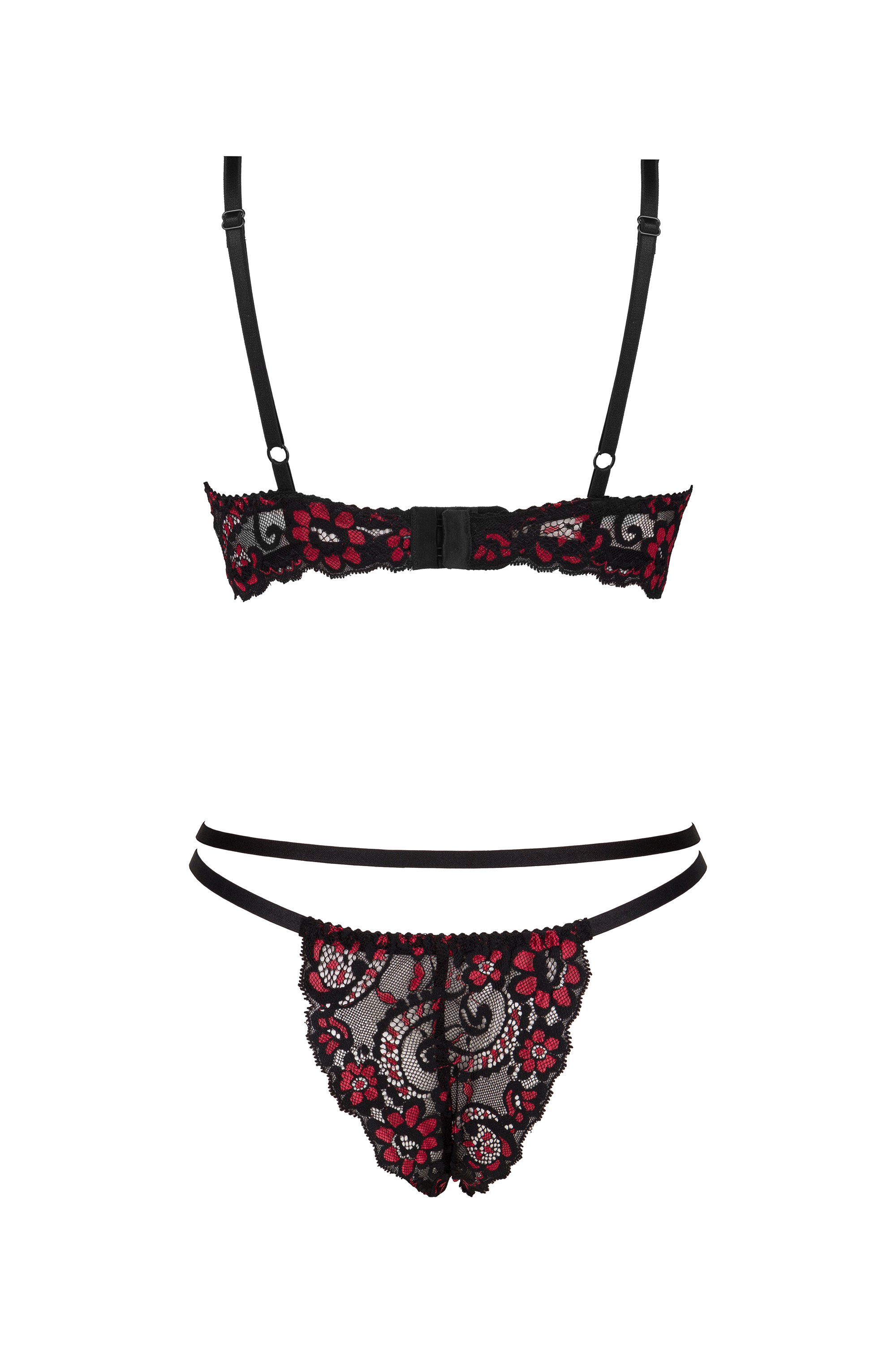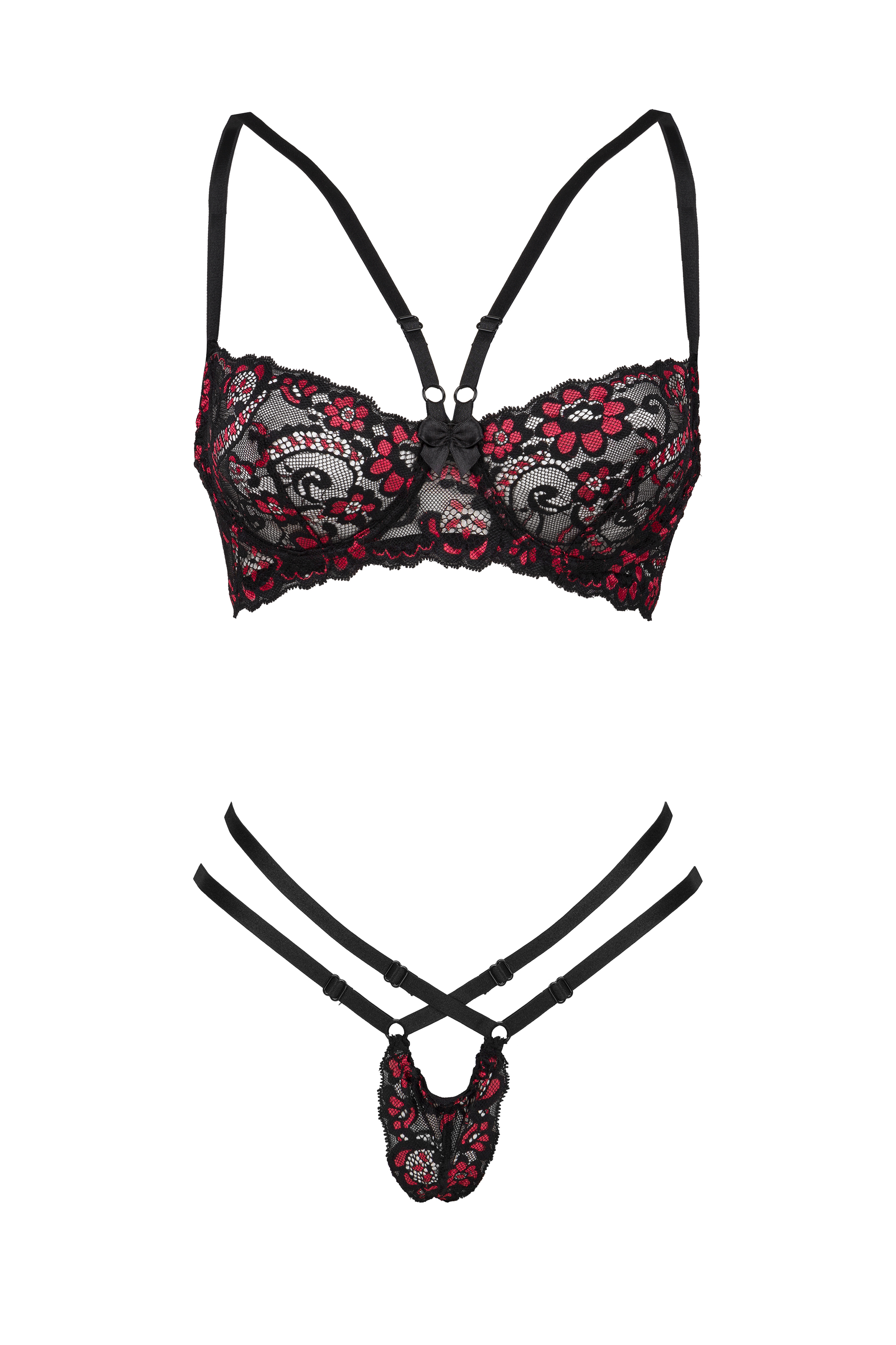 Komplet wykonany z czarnej koronki z czerwonymi połyskującymi kwiatami. Biustonosz posiada regulowane ramiączka i pięknie eksponuje dekolt. Stringi z regulowanymi paskami idealnie komponują się z biustonoszem, tworząc zmysłowy duet. Komplet ten doskonale podkreśli kobiece kształty, dodając pewności siebie.