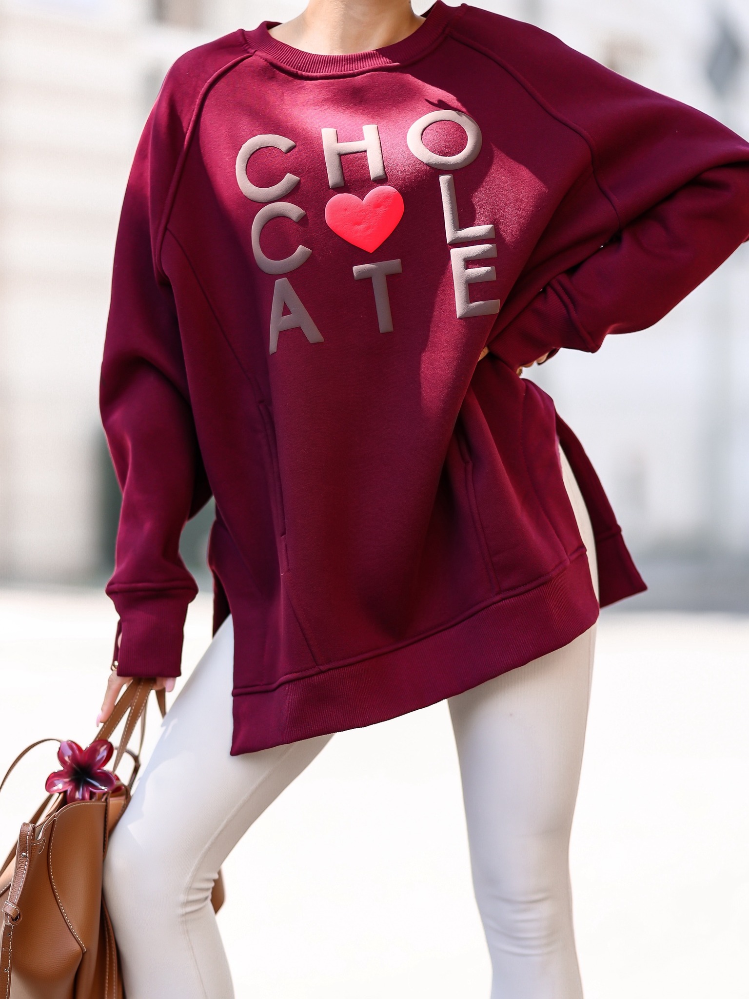 To nie jest zwykła bluza – to modowy manifest. Bordowa, wykonana w 100% z miękkiej bawełny, zdobiona efektownym czekoladowym napisem z czerwonym sercem, od razu przyciąga wzrok. Jej oversizowy krój z obniżoną linią ramion i rozcięciami po bokach to idealne połączenie swobody ruchu i trendów prosto z wybiegów.