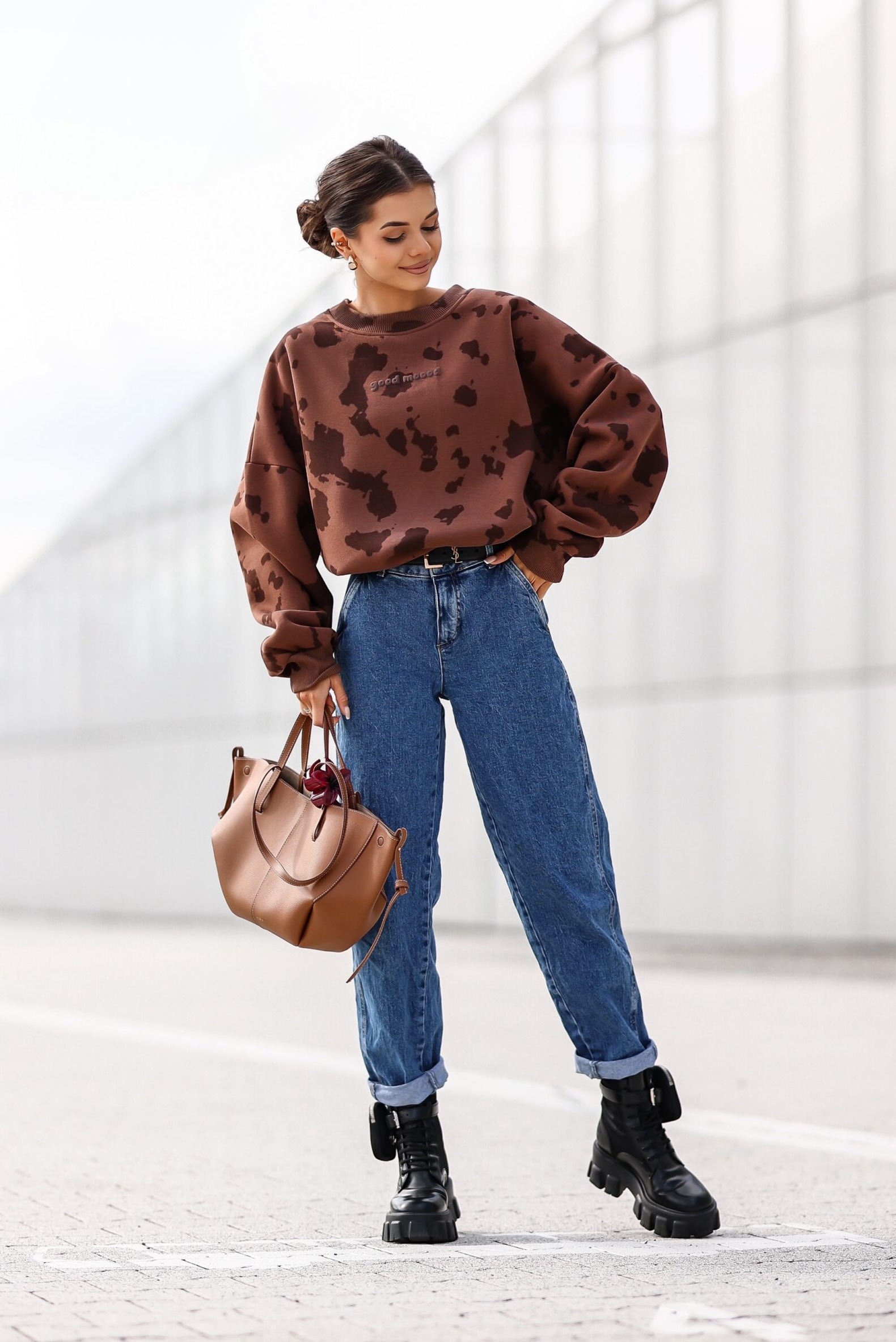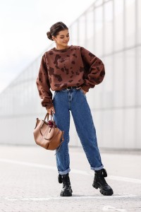 Modny wzór w łatki w kolorze czekoladowym – lekko nonszalancki, bardzo Instagramowy, idealny do miejskich stylizacji.