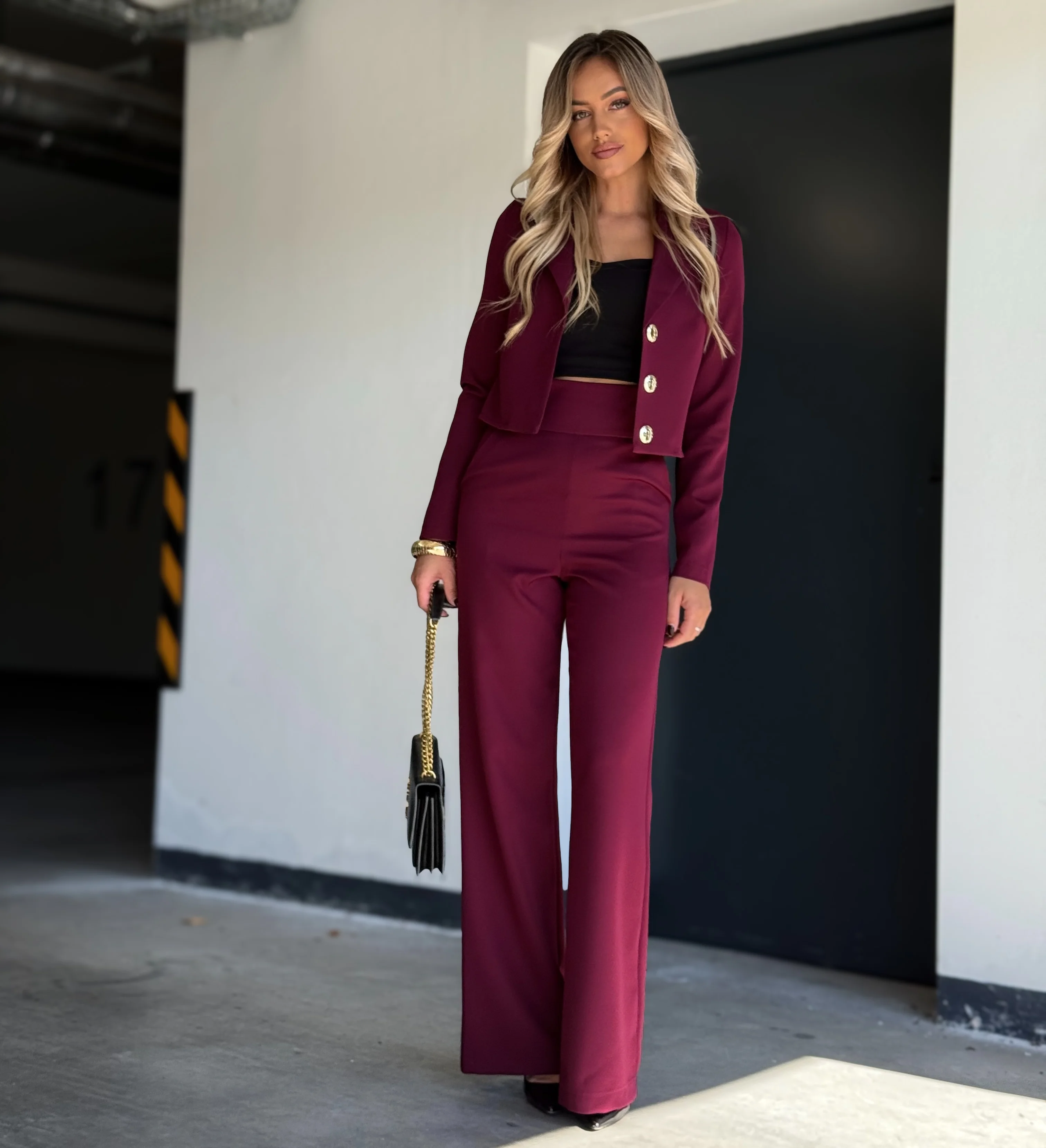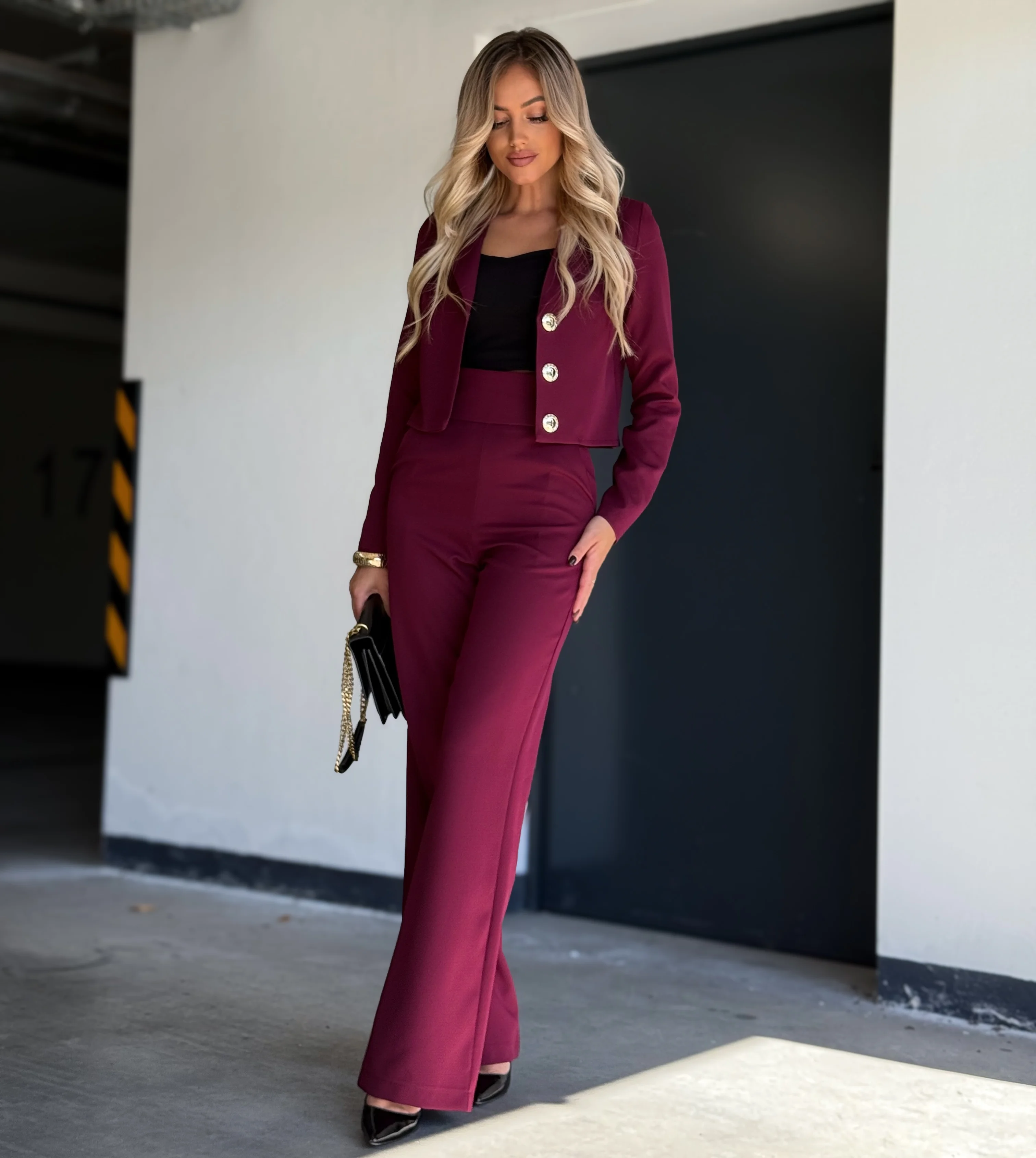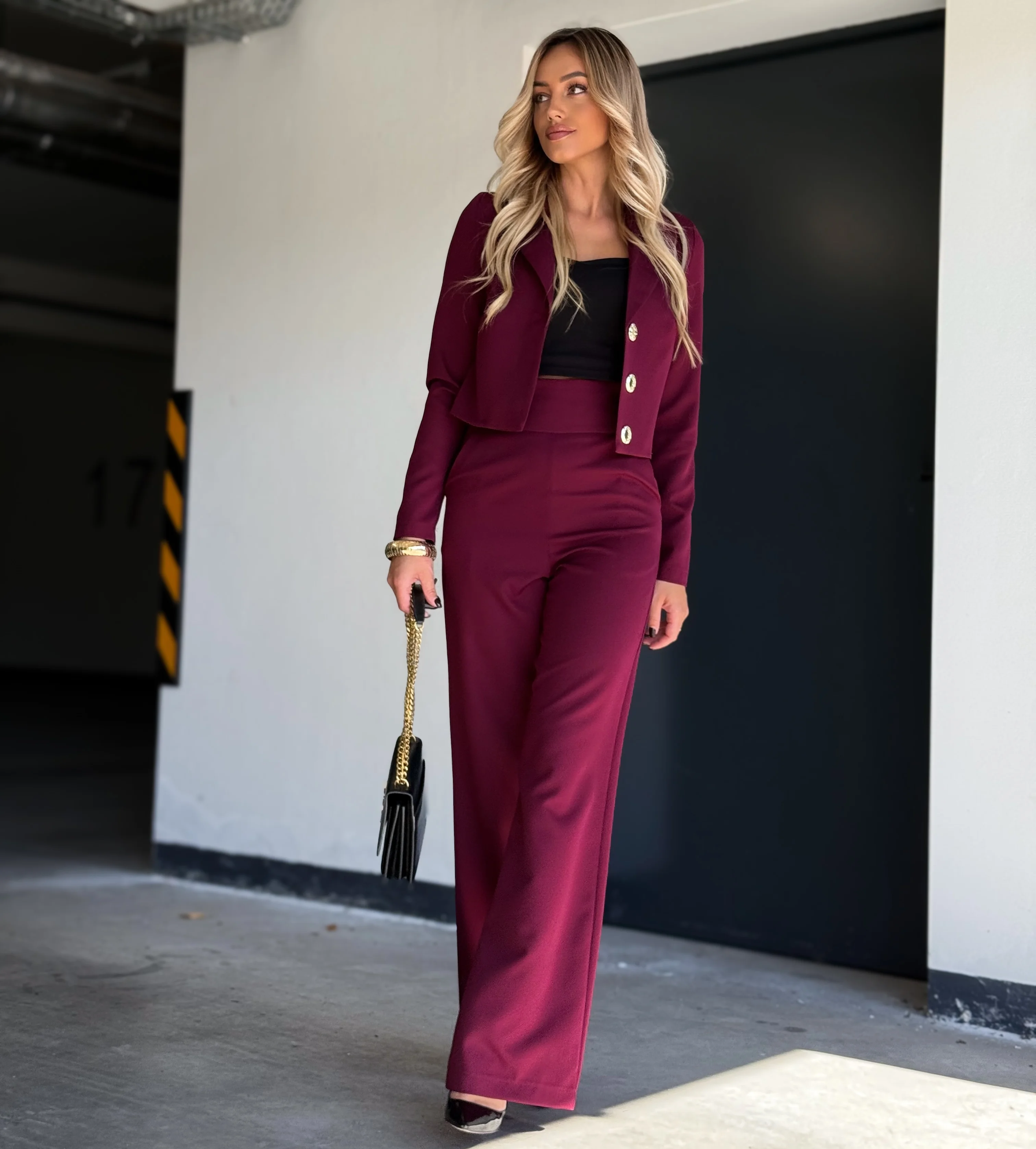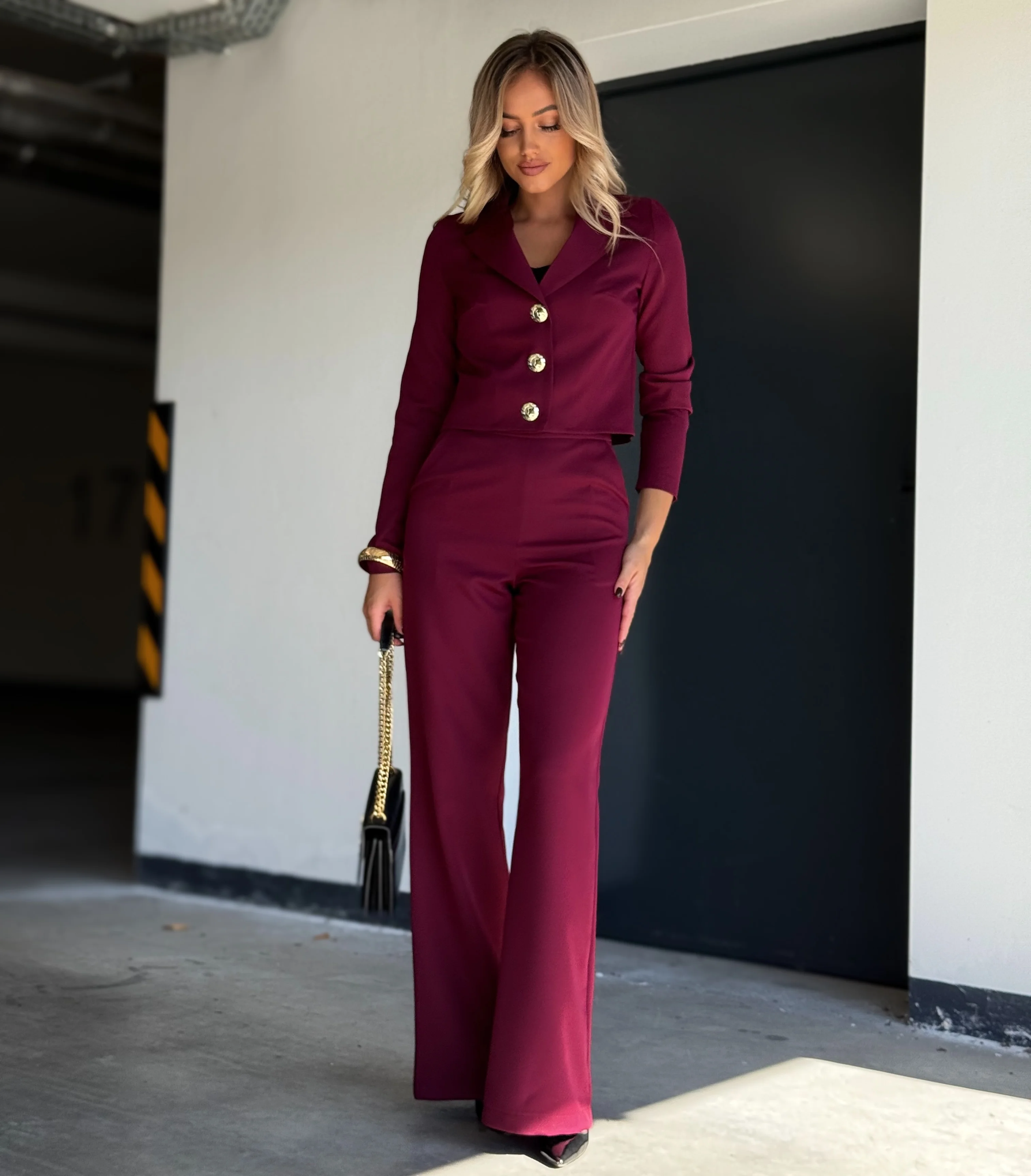 Ten zestaw to hołd dla współczesnej elegancji: modny bordowy o matowym wykończeniu, perfekcyjny krój i detal, który zdradza klasę – złote guziki na krótkiej marynarce.