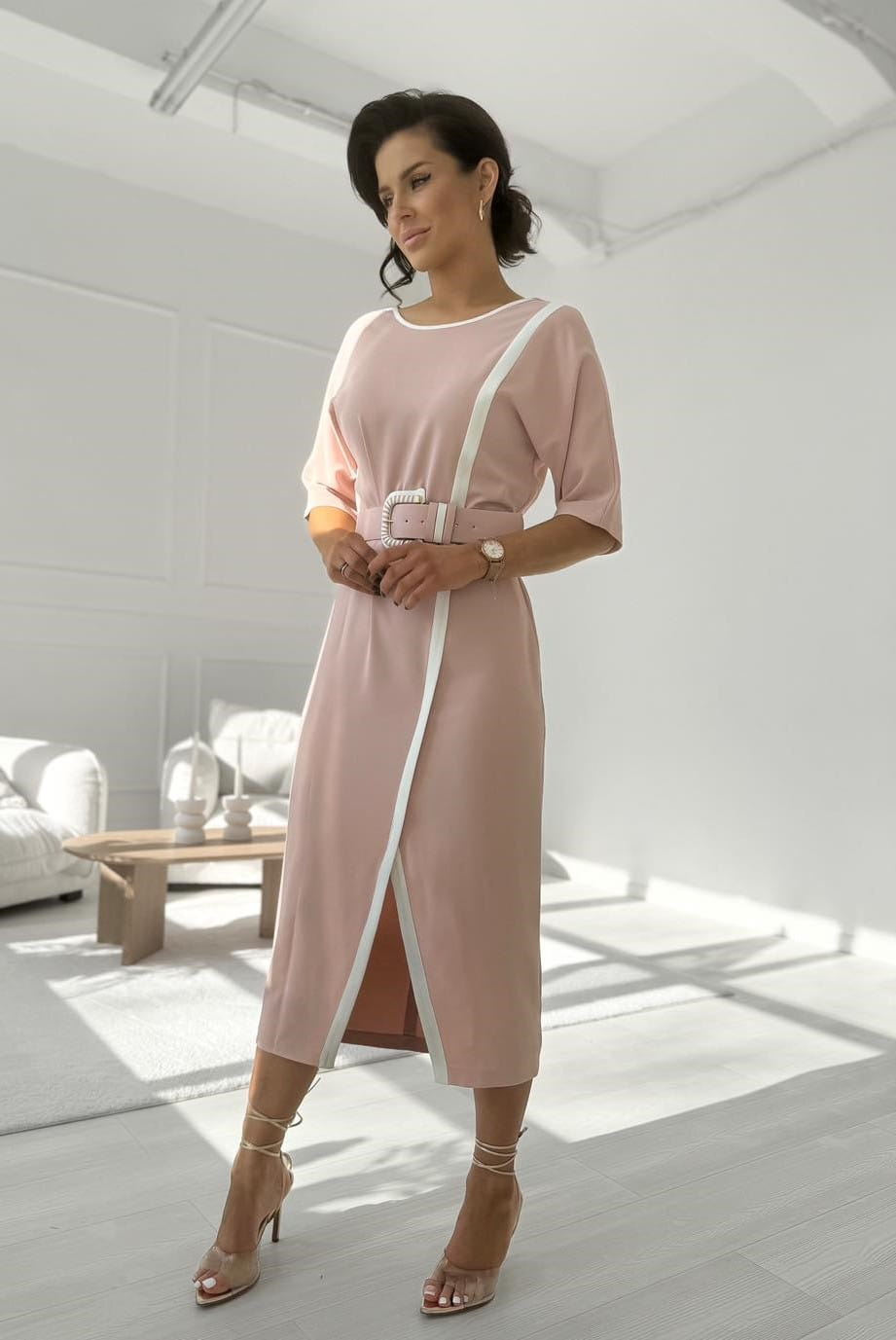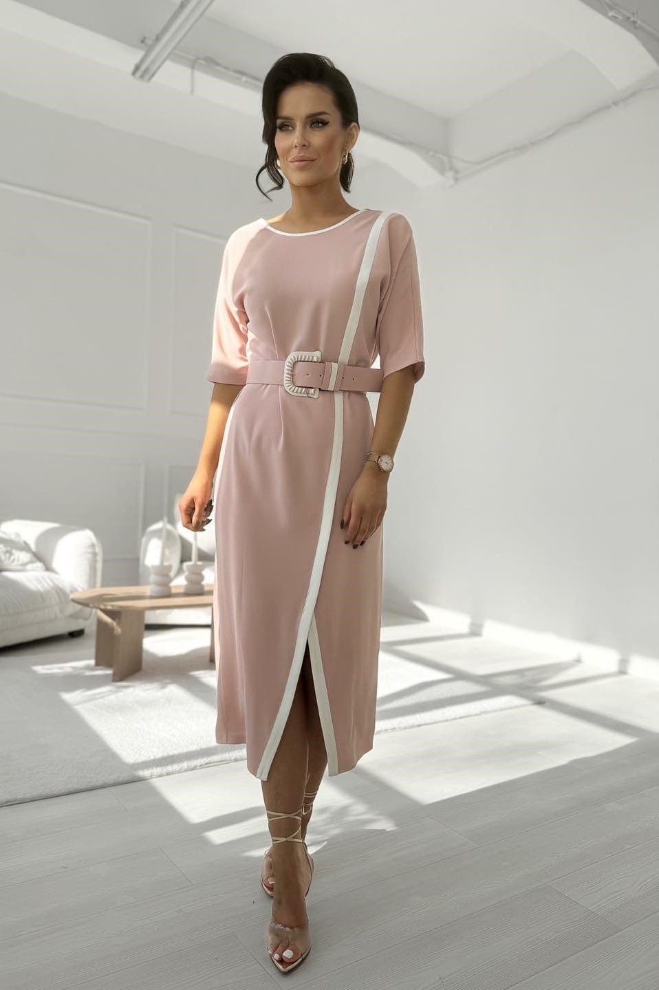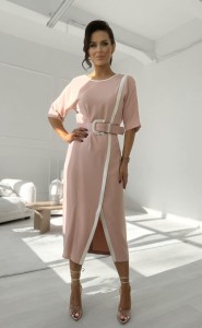 Elegancka sukienka damska w kolorze pudrowego różu z paskiem i ozdobną lamówką.
