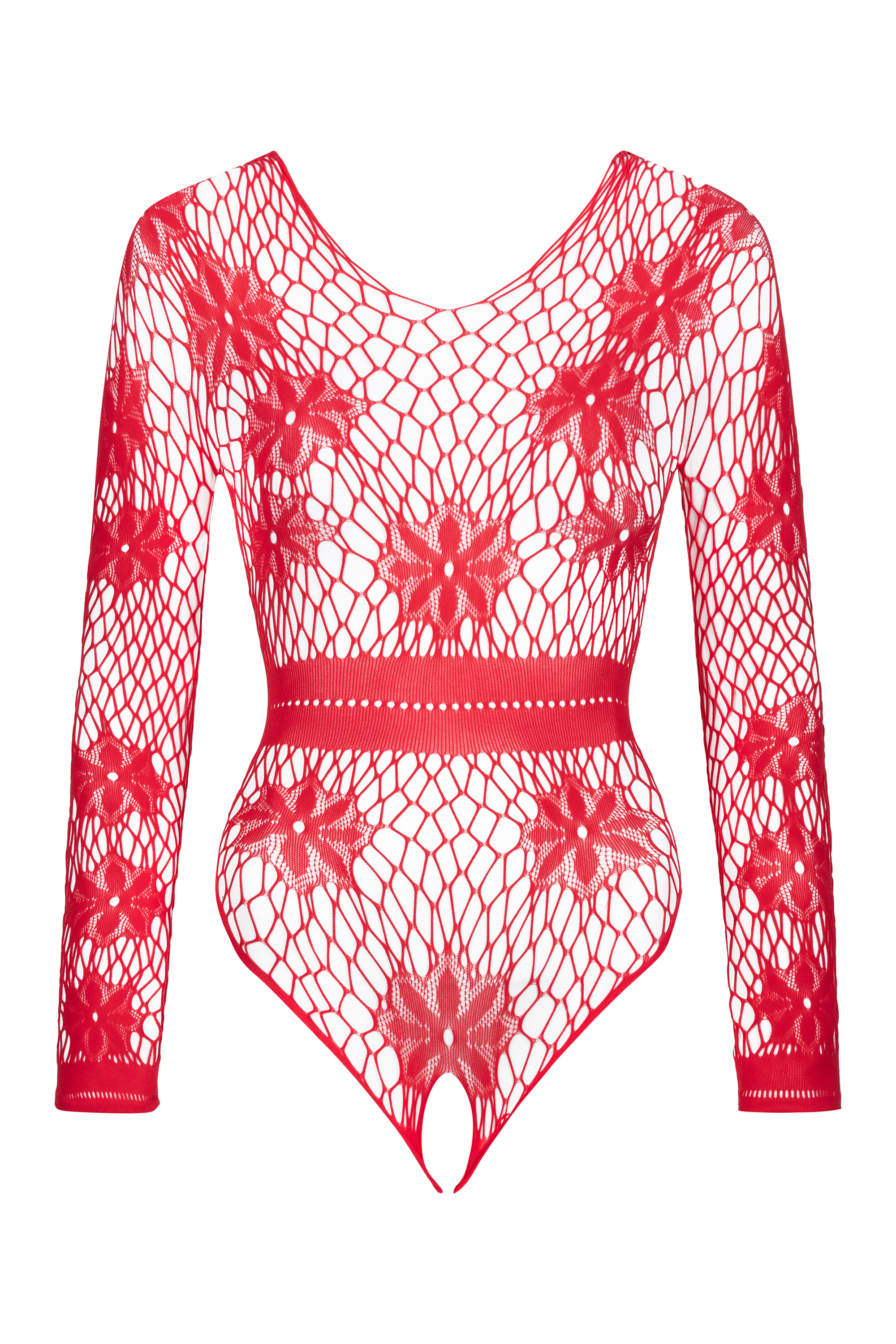Regina Red – czerwone body z siateczki w kwiaty. Długi rękaw, głęboki dekolt na plecach. Elastyczne, z otworem w kroku. Pasek noś między biustem lub na plecach. Zmysłowe i wygodne – idealne na wieczór i na prezent.