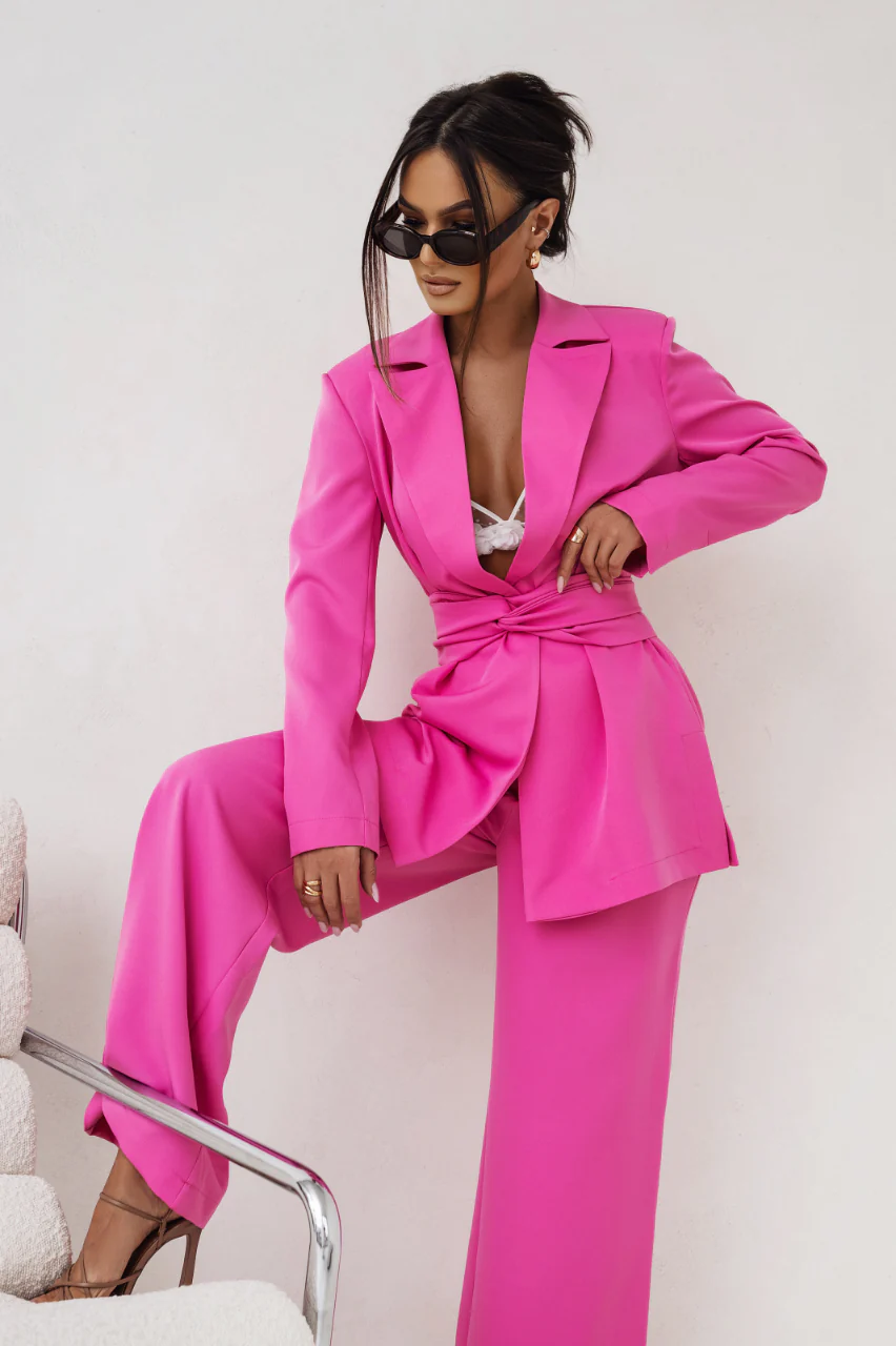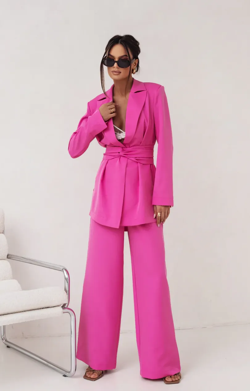 Garnitur damski Emma od LaBalancia to połączenie elegancji i wygody w nowoczesnym wydaniu. Oversizowa marynarka z paskiem pięknie modeluje sylwetkę, a szerokie spodnie dodają klasy i lekkości. Wykonany z luksusowej wiskozy z elastanem, zapewnia komfort noszenia przez cały dzień. Wybierz intensywny róż i podkreśl swój niepowtarzalny styl!