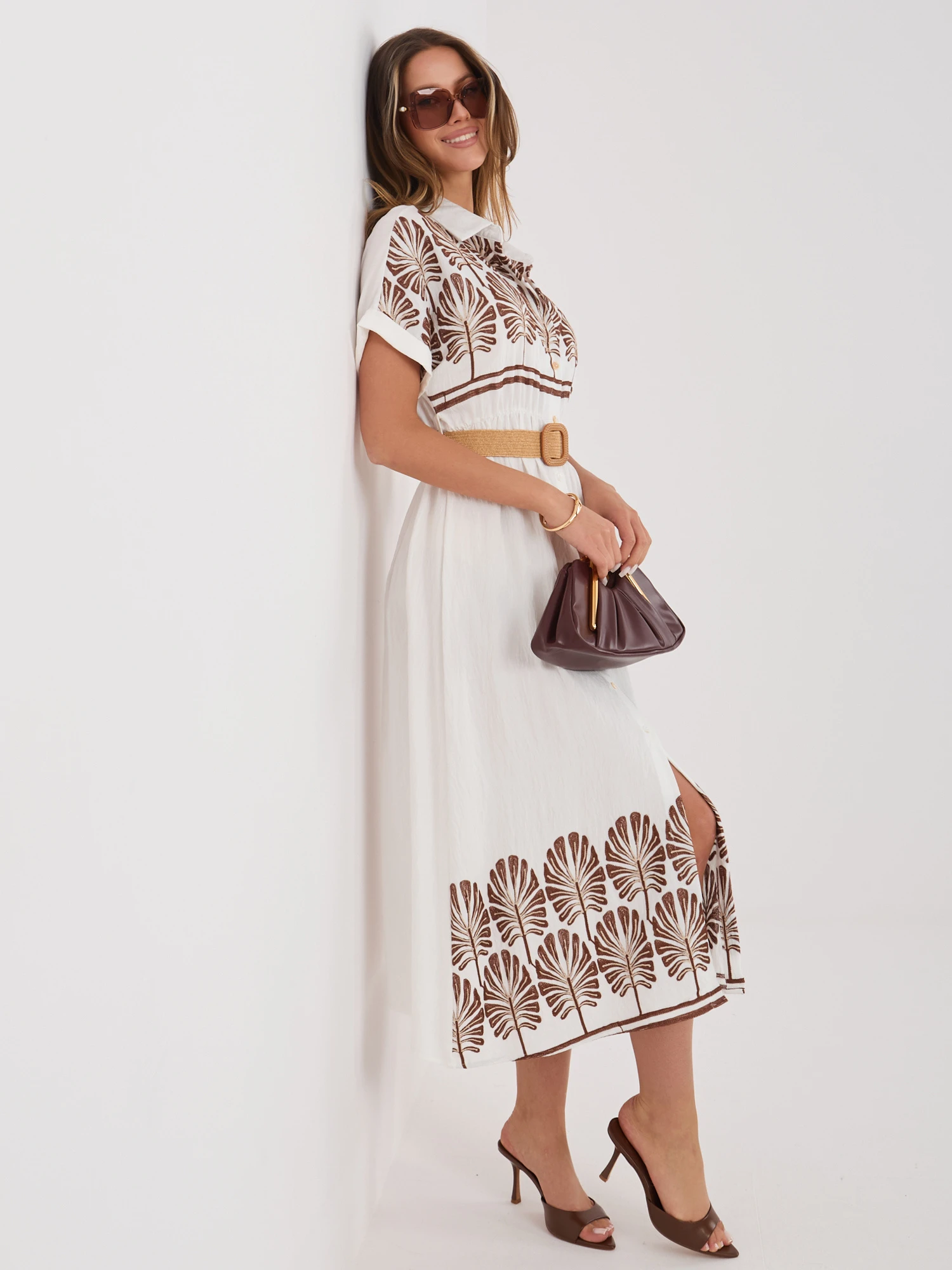 Sukienka Koszulowa z Paskiem Biała w Brązowe Palmy – Esencja Włoskiego Szyku