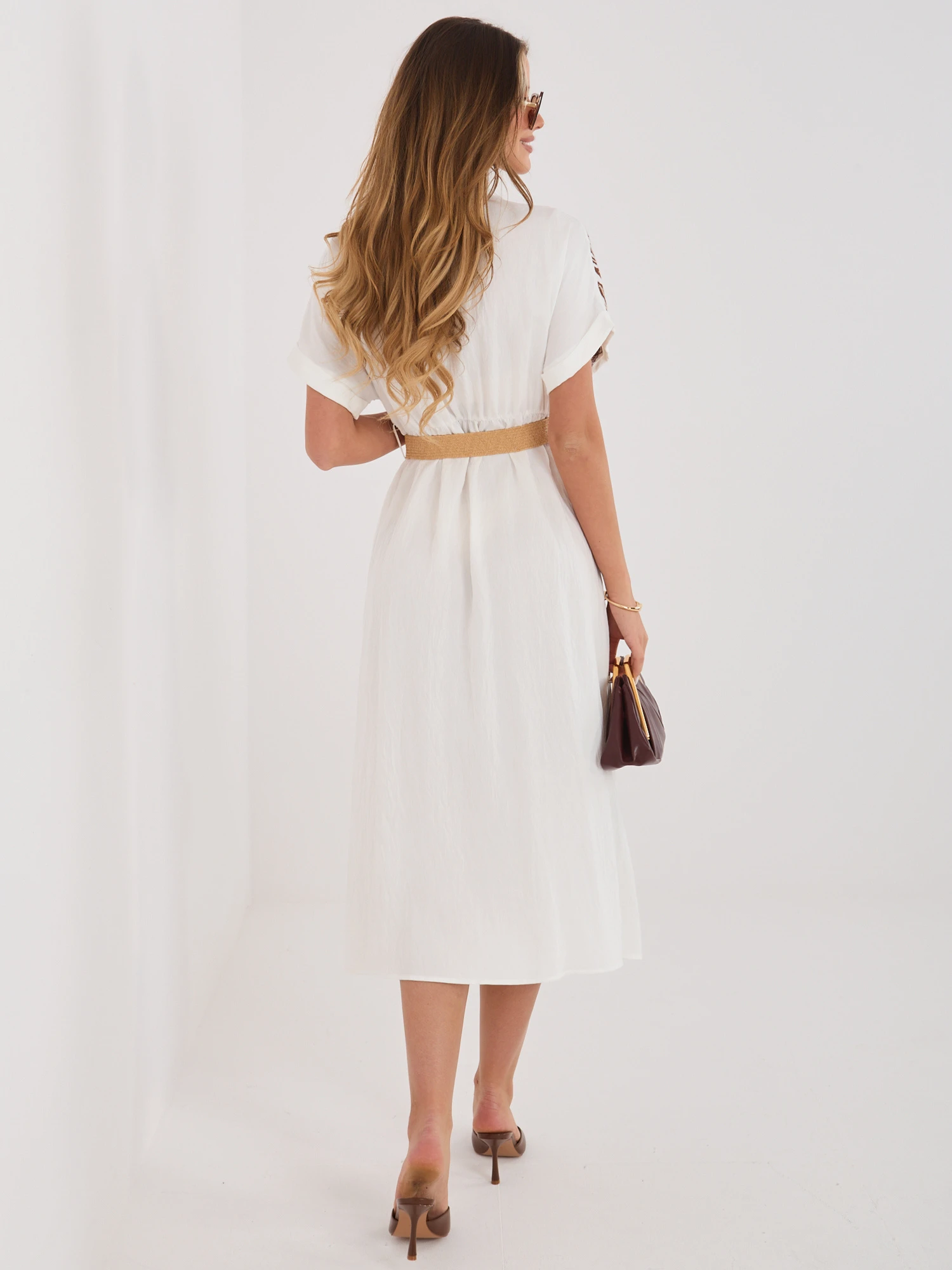 Wyobraź sobie poranek na włoskiej riwierze. Ta sukienka to esencja śródziemnomorskiego szyku, stworzona dla kobiet, które od mody wymagają więcej niż tylko wyglądu. Biel połączona z głębokim brązem egzotycznego wzoru to duet, który natychmiastowo buduje status i elegancję, bez zbędnego wysiłku.
