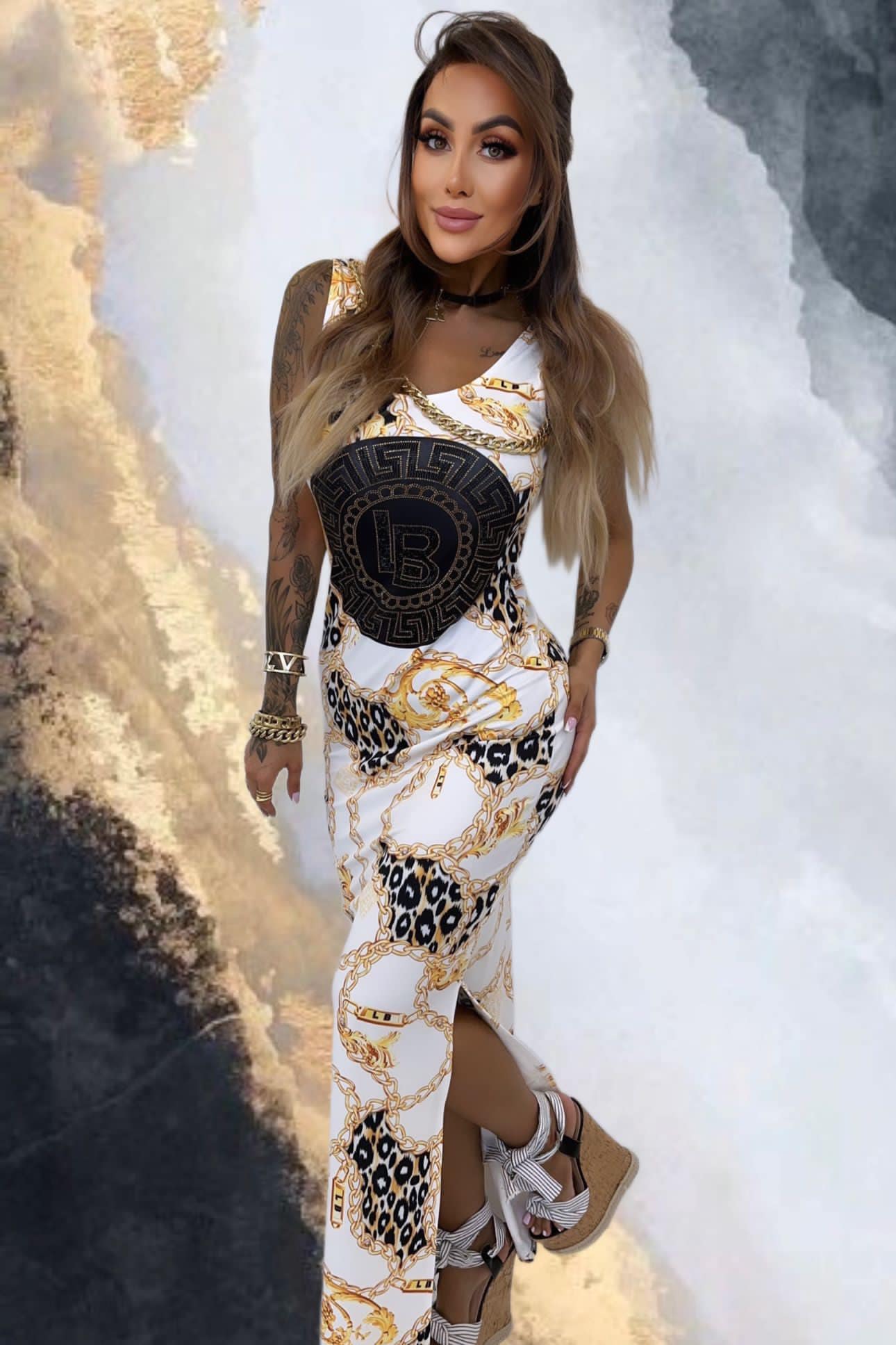 Aby podkreślić Twój dekolt, sukienka jest ozdobiona złotym łańcuchem, który nadaje jej niezwykłego blasku.