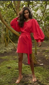 Sukienka w kolorze fuksji z odcieniem malinowym z ozdobnymi szerszymi rękawami AMELIA polskiej marki Ezuri